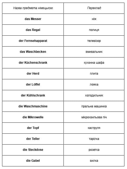 Як і в будь-якій іншій мові, в німецькій окремою темою стоїть «кухня». На ній зазвичай багато предметів, які дуже важливо запам’ятати. Адже, наприклад, столові прибори «Besteck» можна використовувати не лише вдома, а й у ресторані. У таблиці нижче зібрано список найосновніших предметів, які можуть бути використані на кухні.