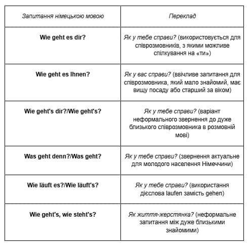 У Німеччині поцікавитися у співрозмовника, як його справи, можна різними способами. Розглянемо найпопулярніші в таблиці нижче.