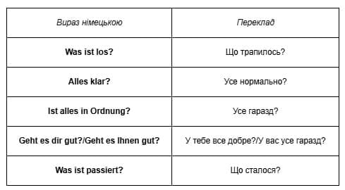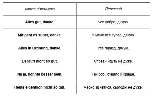 Проживаючи в німецькомовній спільноті, також потрібно знати, як відповісти на запитання «як справи» німецькою. Для цього можна використовувати стандартні відповіді, які будуть представлені в таблиці нижче (вибір слід робити за ситуацією).