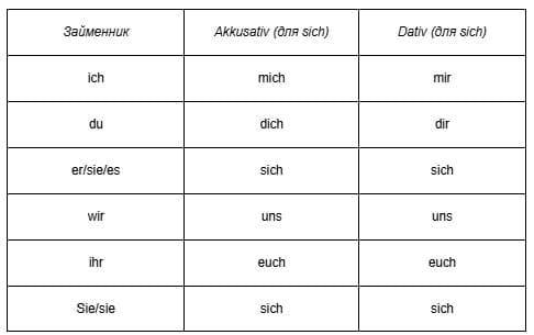 За правилами більша частина активно використовуваних зворотних дієслів застосовується з Dativ або Akkusativ. Займенник «sich» у всіх випадках змінюється за відмінками, особами та числами. Далі в таблиці розглянемо, як змінюється займенники з різними відмінками та особами. (таблицю зробити скріном для унікальності).