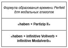 В немецком языке образование формы Perfekt для модальных глаголов возможно по двум формулам (в таблице ниже)