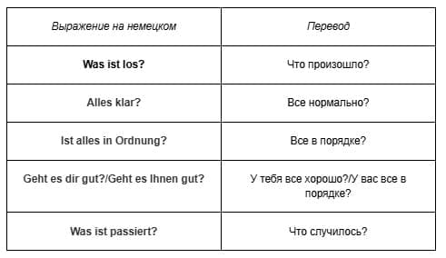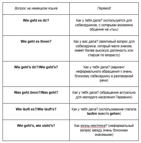 В Германии поинтересоваться у собеседника, как его дела, можно разными способами. Рассмотрим самые популярные в таблице ниже