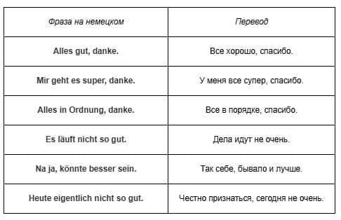 Проживая в немецкоговорящем сообществе, также нужно знать, как ответить на вопрос «как дела» на немецком. Для этого можно использовать стандартные ответы, которые будут представлены в таблице ниже (выбор следует делать по ситуации).